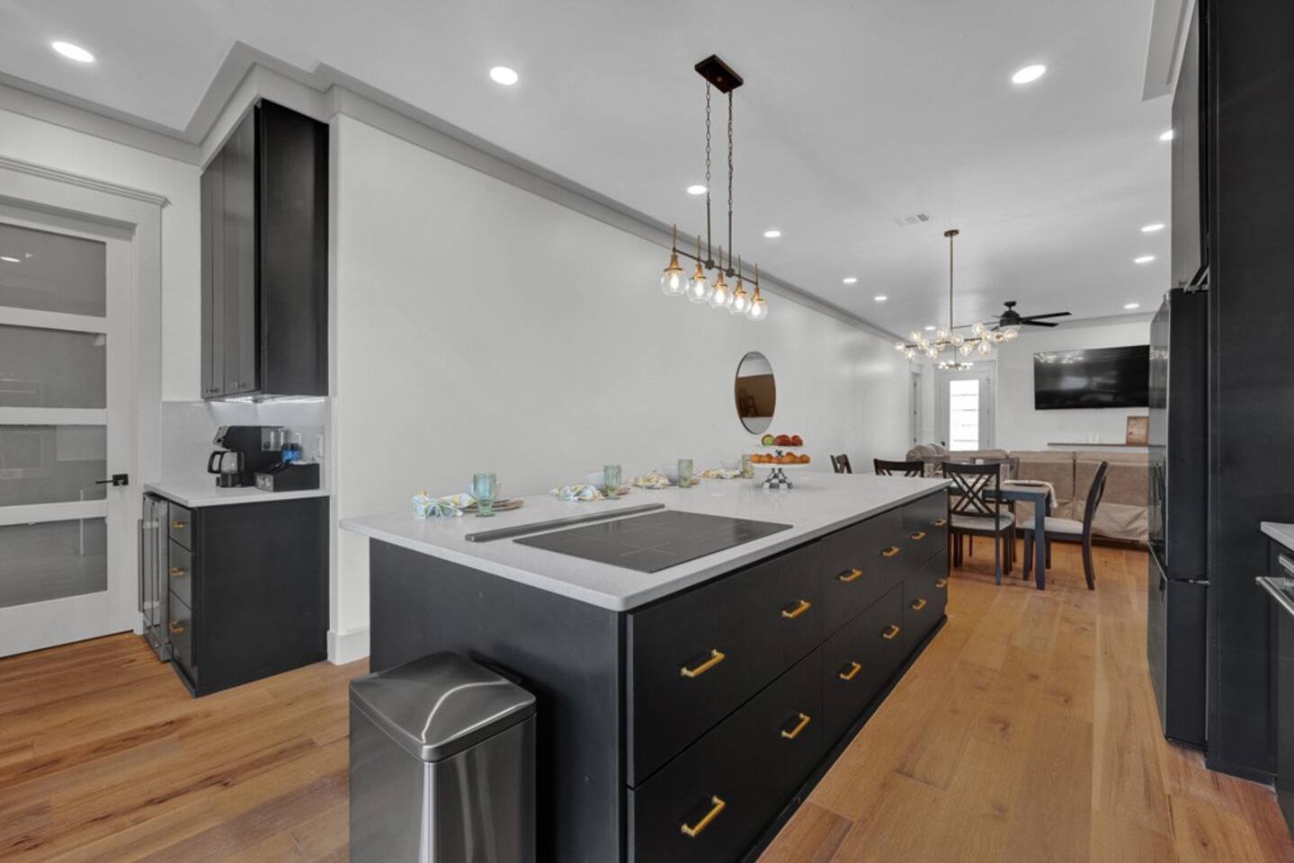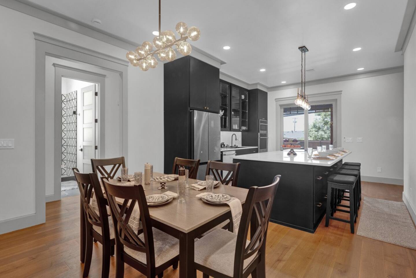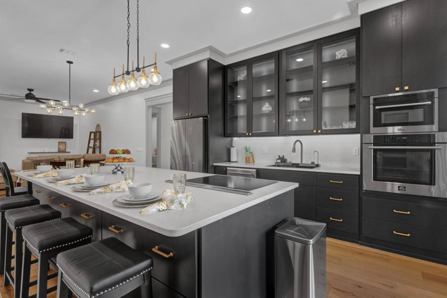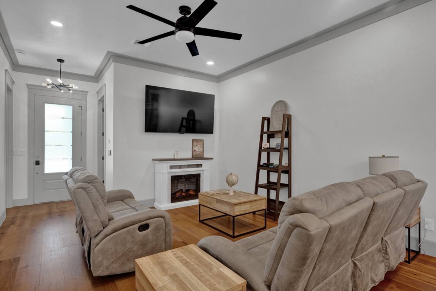 This is new construction! The house has a large common area that includes a seating area with an electric fireplace and large TV, a dining area that has a table and seating for six, a gourmet kitchen with a large bar and outdoor covered patio with seating, a firepit, table and outdoor grill. The house has three bedrooms, two and a half bathrooms, laundry room, and a two-car garage. The master suite has a dedicated workspace, walk-in closet and a bathroom with a jetted tub and rain head shower. The other two bedrooms share a bathroom with shower.