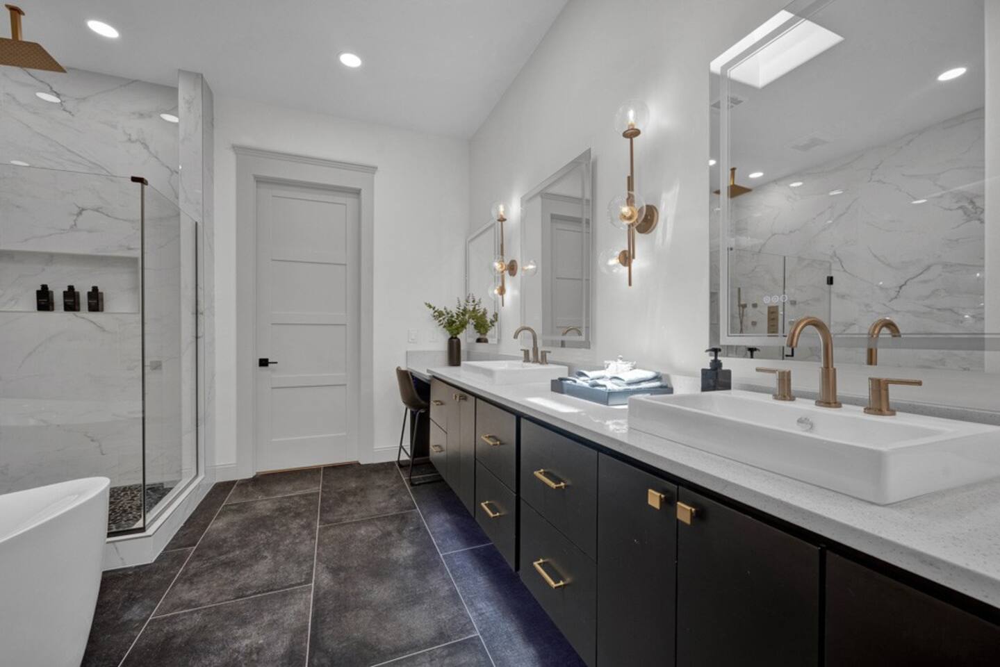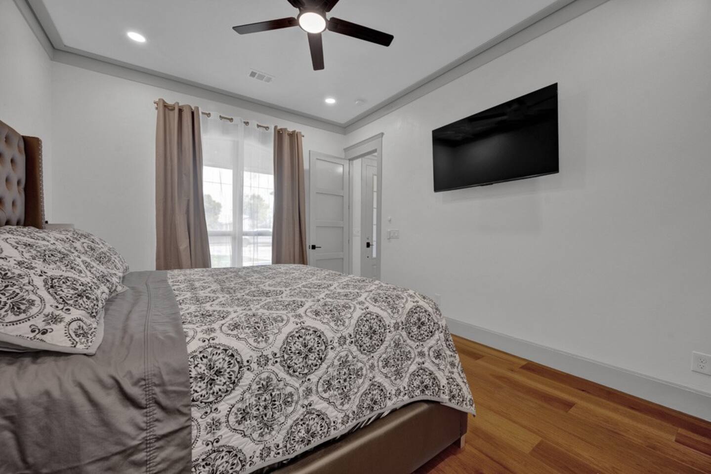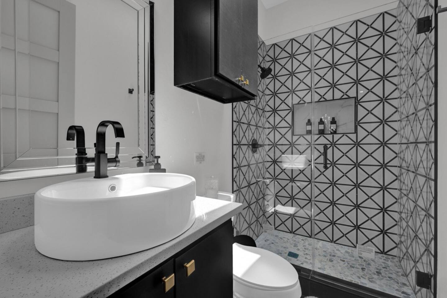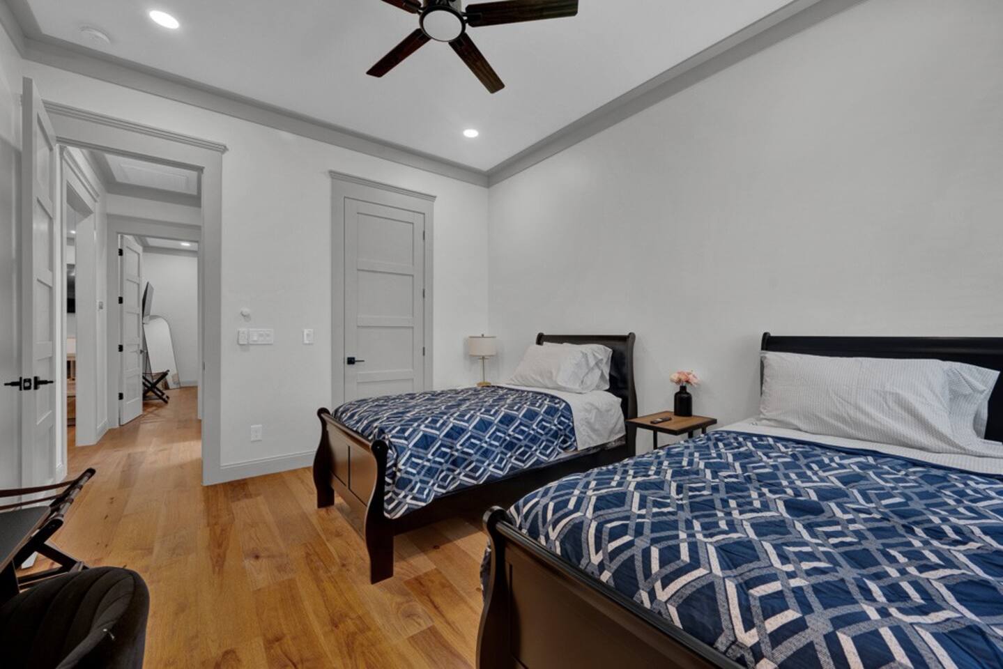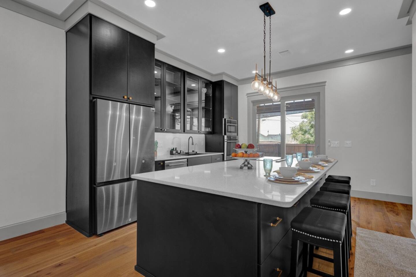 This is new construction! The house has a large common area that includes a seating area with an electric fireplace and large TV, a dining area that has a table and seating for six, a gourmet kitchen with a large bar and outdoor covered patio with seating, a firepit, table and outdoor grill. The house has three bedrooms, two and a half bathrooms, laundry room, and a two-car garage. The master suite has a dedicated workspace, walk-in closet and a bathroom with a jetted tub and rain head shower. The other two bedrooms share a bathroom with shower.