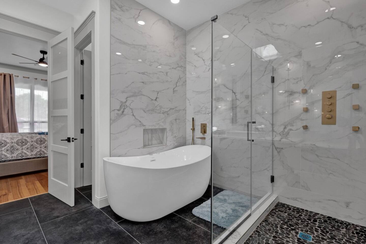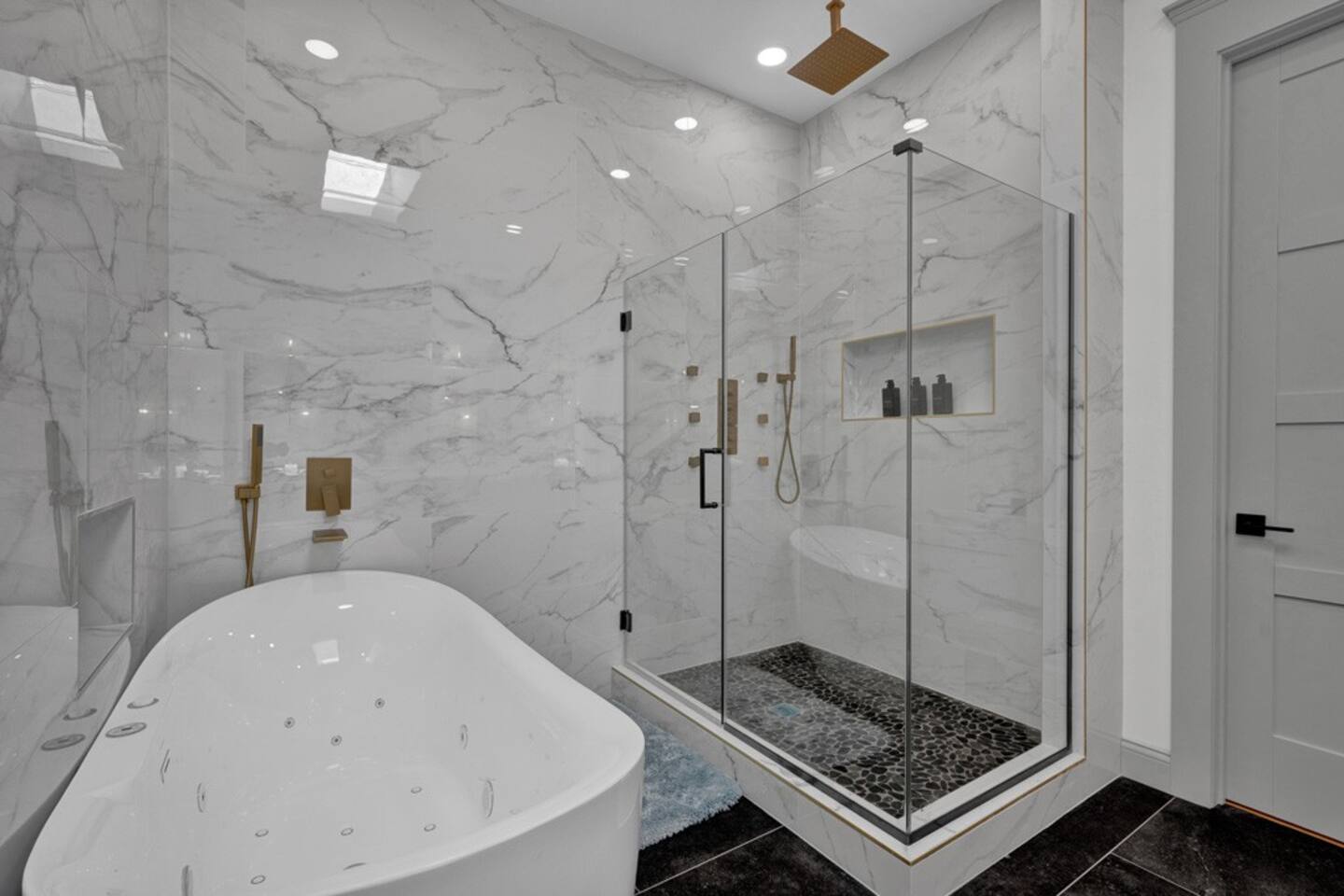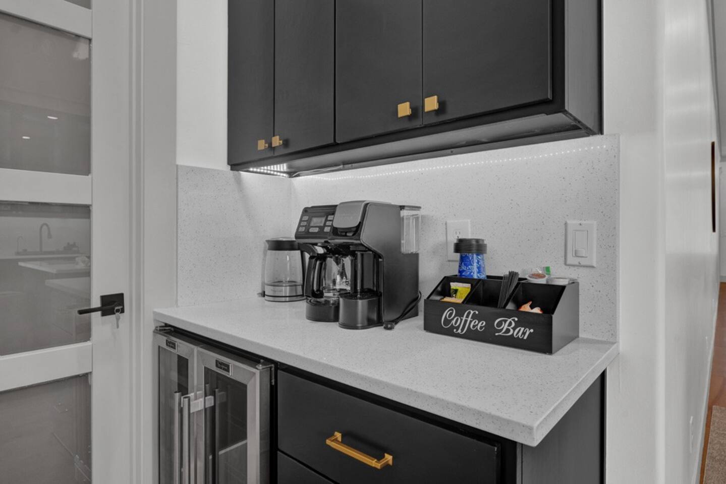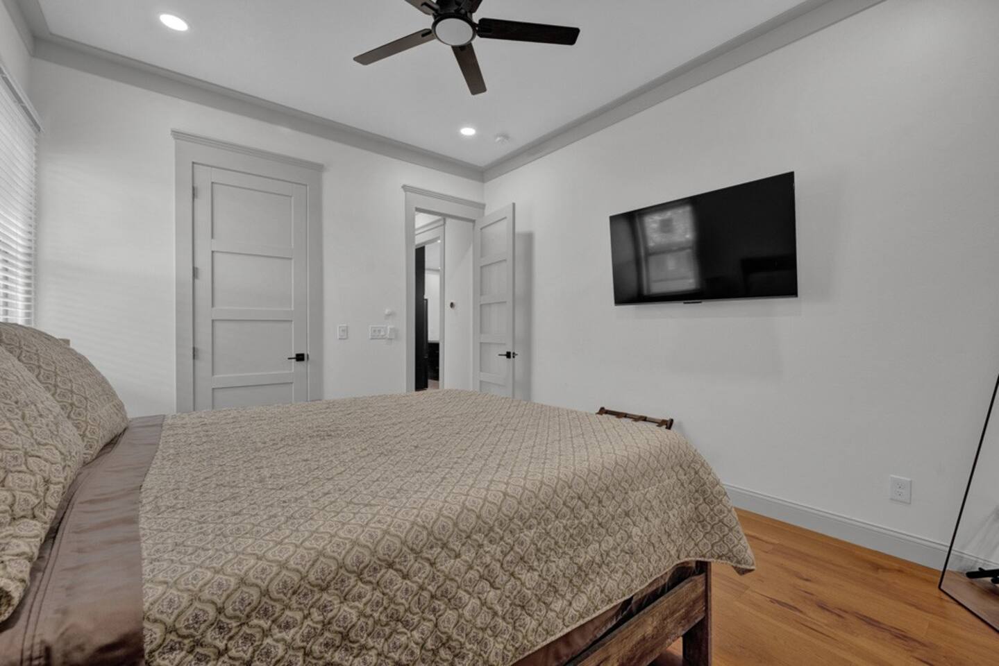This is new construction! The house has a large common area that includes a seating area with an electric fireplace and large TV, a dining area that has a table and seating for six, a gourmet kitchen with a large bar and outdoor covered patio with seating, a firepit, table and outdoor grill. The house has three bedrooms, two and a half bathrooms, laundry room, and a two-car garage. The master suite has a dedicated workspace, walk-in closet and a bathroom with a jetted tub and rain head shower. The other two bedrooms share a bathroom with shower.