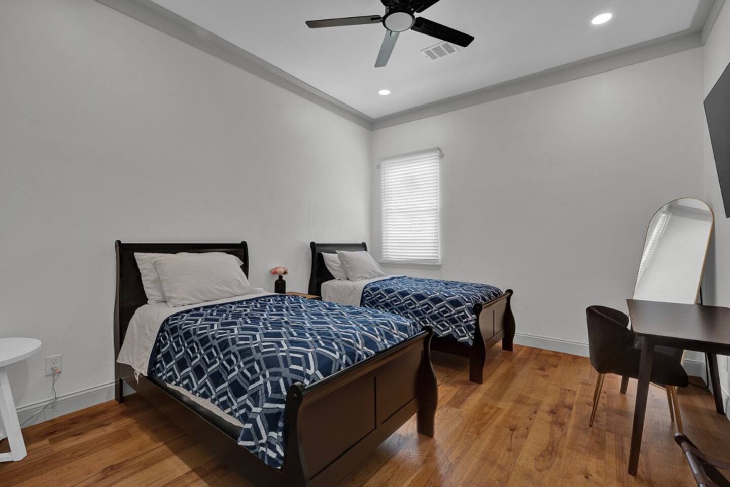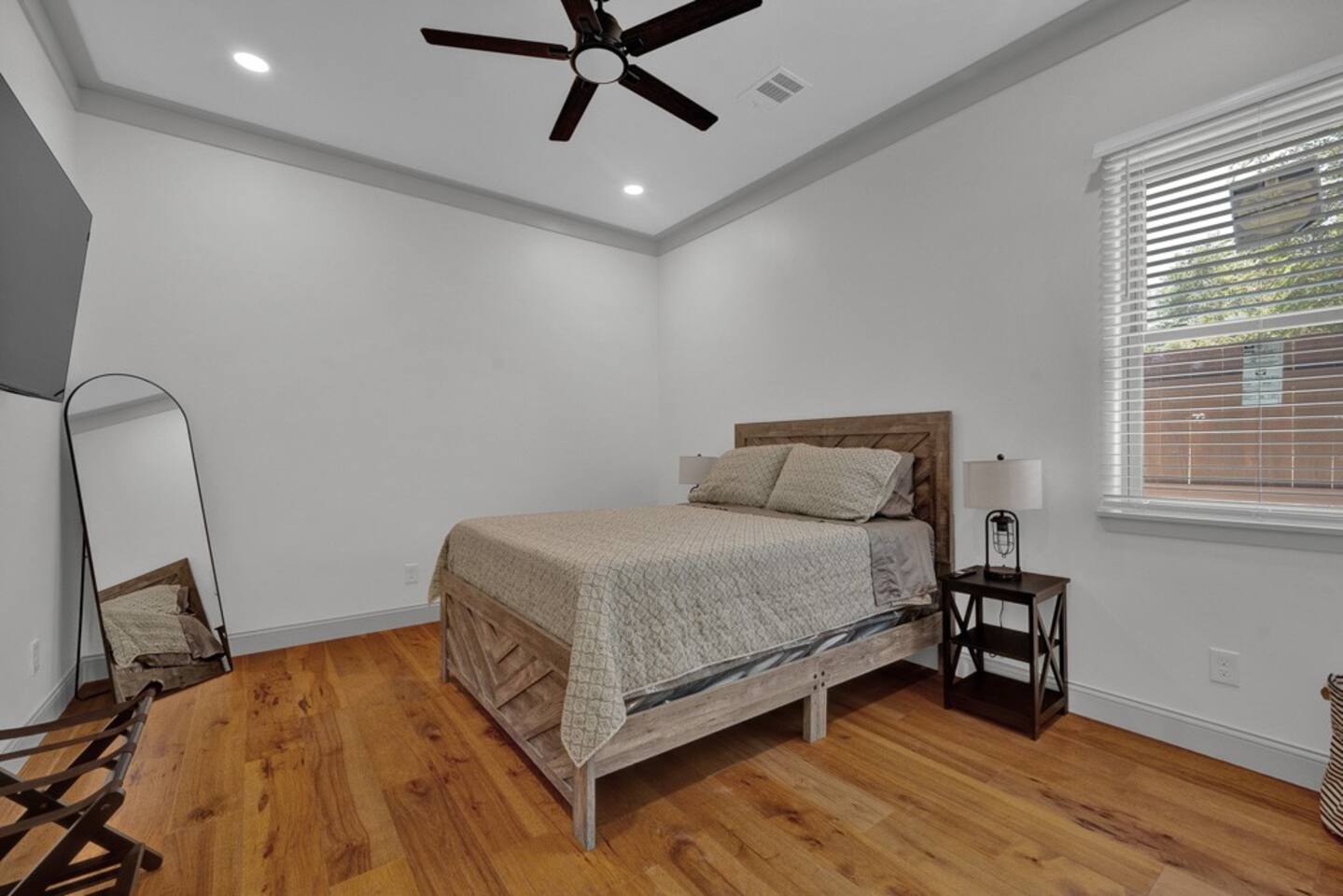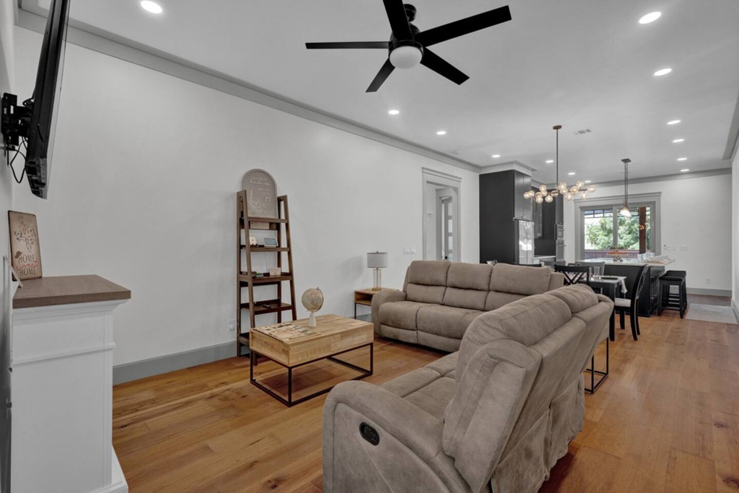 This brand-new home is perfect for business professionals! Just off I-40 and minutes from the airport and downtown, this property has a large master suite with jetted tub, large shower, walk-in closet and dedicated workstation with printer. Enjoy the common area that runs the length of the house that includes a seating area with electric fireplace and large smart TV, a dining area with seating for six, a gourmet kitchen with a huge bar, and covered patio with outdoor seating and a firepit.