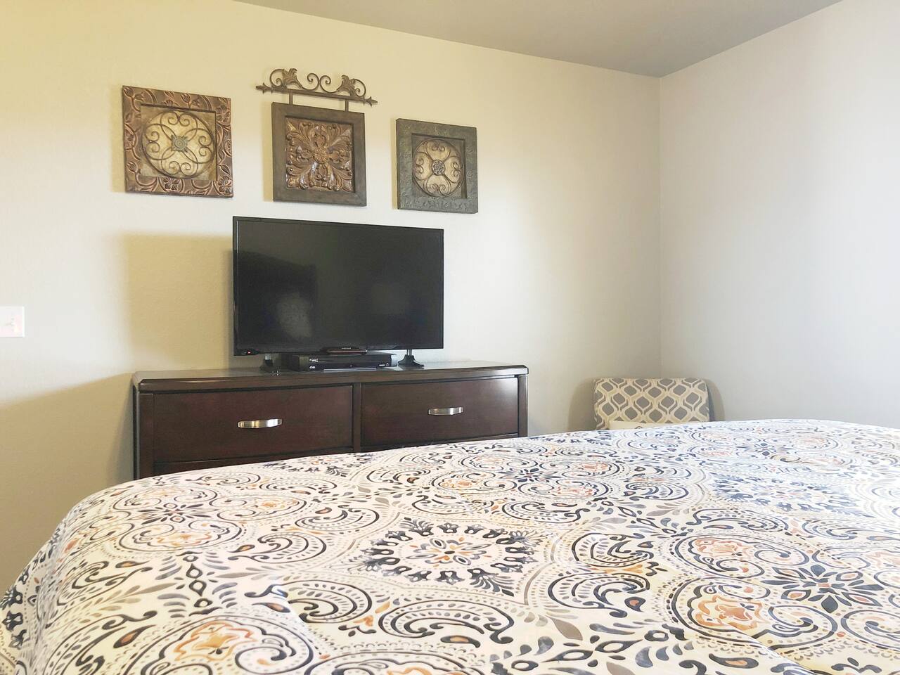 McKinley House is located in a nice, quiet, and safe neighborhood just minutes from I-40 and I-27. In total, the house is 1,226 sq. ft. and has a living area, dining area, kitchen, two bathrooms, laundry room, patio, outdoor grill, fenced backyard, and up to three bedrooms. Enjoy free high-speed Wi-Fi and Fire TV, Prime Video, Paramount + and HBO Max. Street, driveway or garage parking is available free of charge. There is a garage attached to the house. Half of the garage functions as a free weight gym with a sauna and the other half for parking. When booking, you are getting a private stay. Bedrooms are available depending on your needs and the number of guests you book, so please be sure to indicate the total number of guests who will be staying overnight. The living and dining area is 244 sq. ft. with a ceiling fan, couch, two chairs, coffee and end tables, lamps, a 50" flatscreen TV on swivel stand, and dining table with seating for six. The kitchen includes an AM/FM/CD player, refrigerator and freezer with ice maker, electric stove and oven, microwave, dishwasher, garbage disposal, coffee maker and toaster (along with spices, cooking pots and pans, plates, bowls, glasses and silverware). Some travel incidentals are available for a nominal fee. The outdoor patio has a table with four chairs. There is a propane grill and children's play area in the fenced back yard. The laundry room includes a washer and dryer (including detergent) with an iron and ironing board. KING SUITE: This is the default room for guests. The King Suite is a spacious 192 sq. ft. room with a ceiling fan and a king size bed with 14" plush memory foam mattress, nightstand, sleep sound machine with alarm clock, dresser, mirror, computer desk with chair and lamp, and a 39" flat screen TV. The suite has a private bathroom with a shower and a large walk-in closet. This suite accommodates two guests. QUEEN ROOM: The Queen Room is a 140 sq. ft. room with a ceiling fan and a queen size bed with firm mattress, nightstand, sleep sound machine with alarm clock, mirror, and 39" flat screen TV. The room has a closet. This room accommodates two adults. DOUBLE ROOM: The Double Room is a 116 sq. ft. room with a ceiling fan and a twin-size bunk bed with 11" plush memory foam mattress over a double size bed with memory foam mattress and dresser. This room does not have a TV or closet. This room can accommodate three guests and is perfect for kids.